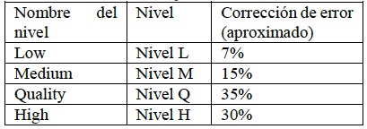 Ante la presencia de ruido o daño parcial del símbolo, los códigos QR proveen corrección de errores [11] [12] los cuales se clasifican por niveles que pueden ser escogidos en el momento en el cual se genera un símbolo (código QR) y éste varía dependiendo de la cantidad de información que admite el código [13]. Dichos niveles son L, M, Q y H, que permiten la corrección desde un 7% a un 30% aproximadamente, como se puede apreciar en la tabla 2 [14]. De acuerdo con [13] el nivel más usado es el M (15%), los niveles Q y H son elecciones normales para un ambiente industrial donde el código QR suele ensuciarse, en cambio el nivel L es para lugares que normalmente son limpios donde normalmente la información contenida es mayor.