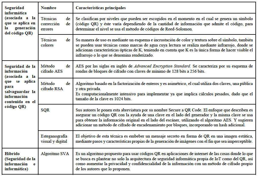 Teniendo en cuenta los tipos de seguridad que aplican en los códigos QR se puede realizar las comparaciones que se evidencian en la tabla 3.