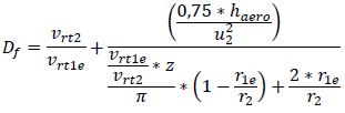 (24)Donde 𝛼. representa el ángulo de salida real del fluido en radianes, 𝐷𝑓 es el factor de difusión, 𝑣𝑟𝑡1𝑒 es la componente tangencial de la velocidad relativa en el radio exterior de la entrada, 𝑣𝑟𝑡2 la componente tangencial de la velocidad relativa en la salida; ℎ𝑎𝑒𝑟𝑜 corresponde a la entalpía aerodinámica, 𝑟.𝑒 es el radio externo de la entrada y 𝑐𝑝1, 𝑐𝑝2 son las capacidades de calor específico a la entrada y salida respectivamente [11].