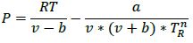 (5)Dónde P denota presión, R la constante universal de los gases, T la temperatura, 𝑣 el volumen específico, 𝑇𝑅 la temperatura reducida, 𝑇𝑐 la temperatura crítica del gas, 𝑝𝑐 la presión crítica del gas y 𝑝𝑣 representando la presión de vapor del gas a una temperatura reducida de 0.7