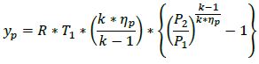 (9)Donde,𝑇1 es la temperatura de entrada, 𝑃1la presión de entrada, 𝑇2 la temperatura de salida, 𝑃2 la presión de salida y el promedio de las relaciones de capacidades específicas a presión y volumen constante de entrada y salida 𝑘, la cabeza politrópica 𝑦𝑝 y la diferencia de entalpías de entrada y salida ℎ1 𝑦 ℎ2 respectivamente.
