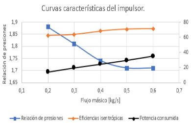 En la figura 5 se muestran las curvas características obtenidas por medio de simulación, en el eje principal se muestran las razones de presión total de la salida y la presión total de la entrada. En el eje secundario están asociadas las eficiencias isentrópicas y la potencia consumida. Es importante destacar de la figura 5 que la relación de presiones tiene el comportamiento esperado al presentar una tendencia al descenso, sin embargo, la eficiencia aumenta después del punto de diseño considerado teóricamente como el punto de mayor eficiencia, el error es causado porque la densidad de malla para flujos mayores al punto de máxima eficiencia no es la adecuada ya que estos son puntos de alta turbulencia.