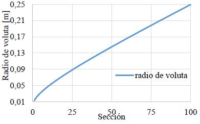 Se usó Matlab para iterar la ecuación 32 con el método de la secante como se ha expuesto anteriormente. Se determinó que el número de secciones necesarias es 100 puesto que es la forma de mantener la continuidad de la curvatura en el modelo CAD realizado en SolidWorks. La ecuación 32 determina la componente axial de la velocidad del flujo, con la cual se definió el estado termodinámico y la geometría de la voluta. En la figura 6 se muestra la variación del radio para la respectiva sección.