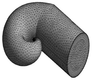 Con la información presentada en la figura 6 se usó SolidWorks para generar una geometría con la cual se simuló el comportamiento del fluido. Se usó una línea tangente a la circunferencia interna de la voluta, con el fin de tener una guía para la salida del fluido. Se agregó una sección adicional para la simulación, en Spaceclaim, para evitar errores numéricos por la violación de las condiciones de frontera establecidas. Se usó una malla de tipo hexaédrica con capas de inflación sobre las fronteras geométricas para obtener mejores resultados en la capa límite y en el desarrollo de la turbulencia a partir de esta. Un análisis de sensibilidad muestra que 225000 elementos y 85700 nodos son suficientes para realizar simulaciones adecuadas. En la figura 7 se presenta el modelo que se usó para mallado.
