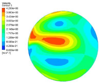 Se observó que las pérdidas de presión en la voluta son ínfimas, sin embargo, otros análisis muestran que el perfil de velocidades obtenido no es de la mejor calidad, como se observa en la figura 8. Óptimamente se busca un perfil anular sobre la sección mostrada, donde la velocidad máxima este en el centro. Los resultados pueden ser revisados teniendo en consideración las turbulencias generadas en el impulsor.