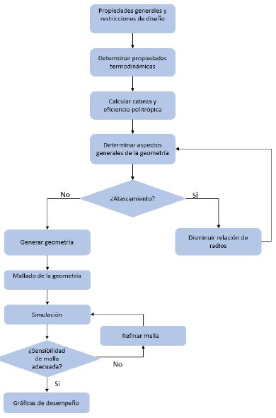 El diseño sigue el diagrama de flujo presentado en la figura 1 en la cual se puede observar de forma general el procedimiento seguido por los autores para diseñar y simular el impulsor.