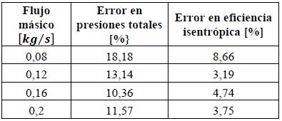 Se simuló la geometría diseñada con la metodología presentada en el documento y se calculó el error relativo entre los cálculos realizados para el flujo másico de 0.4[𝑘𝑔/𝑆] y las simulaciones. Se obtuvo un valor de 3,26% de error para las eficiencias; 3.31 % de error para la temperatura; 13% de error para la presión total de salida y 7,14% de error para la presión estática de salida.