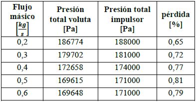Los resultados obtenidos son presentados en la tabla 5 donde se comparan las presiones totales antes y después de pasar por la voluta con el fin de determinar las pérdidas en el flujo.