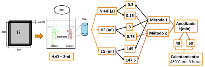Se utilizaron láminas de titanio con un grosor de 0,03 mm y un área de anodización de 2 x 2 cm. La separación entre el ánodo y el cátodo es de 2 cm. Con potencial de 20 V, y utilizando fluoruro de amonio (NH4), ácido fluorhídrico (HF), etilenglicol (EG), en dos tiempos a 40 y 60 minutos con posterior calentamiento a una temperatura de 450° por un tiempo de 3 horas.