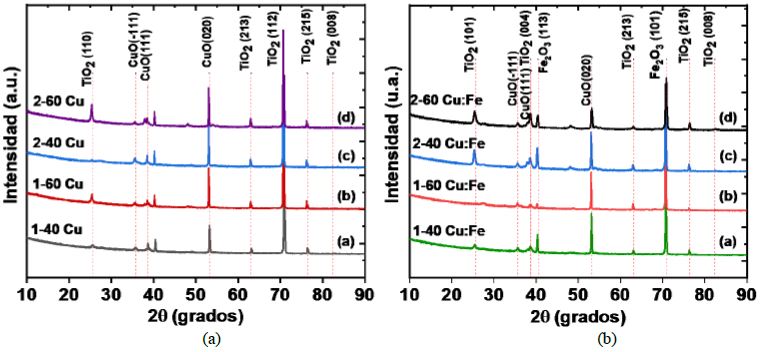 En la figura 2(a,b) el pico correspondiente al plano (101) del TiO2 es más intenso para la muestra en la condición de anodizado 2-60 indicando una fase mayoritaria de anatasa. Los cambios en la intensidad de algunos picos de la figura 2 pueden ser un indicativo de la presencia de la capa de CuO solo o dopado con Fe. Sin embargo, en la literatura dice que una variación en la intensidad es un indicativo del aumento en el grado de cristalización debido a una tendencia a la minimización de la energía superficial interfacial [20].
