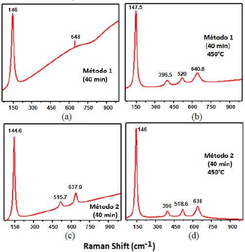 En los dos métodos no hay diferencia, lo que significa que están en la misma estructura cristalina, cuando el material fue sometido a anodizado por los dos métodos y sin calcinar para el método 1 solamente aparece el modo vibracional del átomo del titanio, dónde la estructura se encuentra amorfa, en la parte (b) y (d) cuando ya se encuentra calcinado aparecen cuatro modos vibracionales con la estructura anatasa y en (c) a pesar de que no está calcinado se observan algunos picos correspondientes al oxido de titanio. [25]