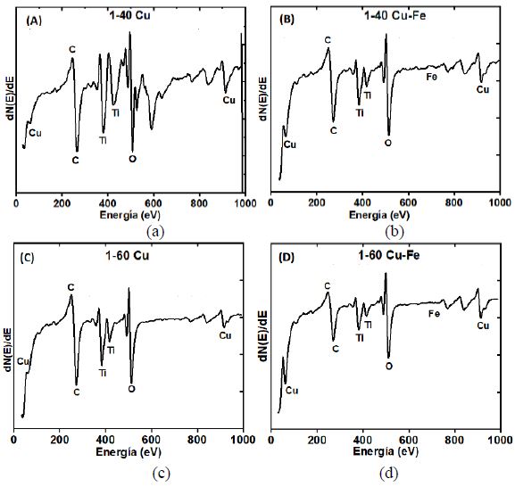 En la figura 5 se observa el análisis de composición química mediante la técnica de espectroscopia de electrones Auger que revelo la presencia de picos de titanio, cobre, hierro, oxígeno y algunas impurezas de carbono. En la parte (a) y (c) para 1-40 Cu y 1-60 Cu, se evidencia la presencia del pico de Ti en las transiciones Auger (L2M2,3M2,3) y (L2M2,3M4,5), localizadas en 387eV y 418eV [26] respectivamente. En la parte (b) y para 1-40 Cu-Fe y 1-60 Cu-Fe, se observa el pico de Fe para la transición (L3VV) en 702.7eV. [27] Al igual que en parte (a) y (c) se evidencian picos de Ti.