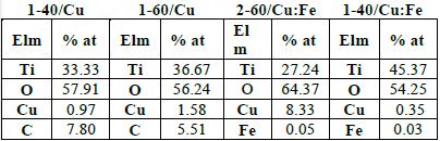 La tabla 2 muestra el análisis EDS con los porcentajes de concentración atómica. Los resultados indican la presencia de elementos tales como titanio, propio del sustrato. A su vez se evidencia la presencia de cobre y hierro propios del recubrimiento.
