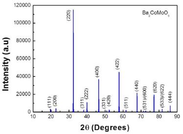 The ideal double cubic perovskite A2BB'O6 is characterized by the formation of a superstructure in which the cations B and B' are organized alternately along the crystallographic axes, coordinated with six oxygens that define the octahedral distribution of the structure. The presence of the superstructure can be determined by X-ray diffraction through the occurrence in the diffractogram of reflection peaks with indexes (311), (331), (511) and (531), which are observable in the theoretical diffraction pattern of figure 1.