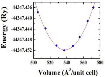 Figure 3 illustrates the energy as a function of volume. Each one of the squared points constitutes an individual calculation and the line corresponds to a fitting with the Murnaghan state equation, which was carried out by using the concept of the least-square fitting method [25]. The minimum of the energy is obtained for - 44347.453444 Ry, the volume modulus Bo = 129.7 GPa, and the equilibrium volume is 485.358 Å3. This value is close to that predicted from the SPuDS, which is 476.764 Å3. From the minimization of energy as a function of the volume of figure 3 within the GGA approximation it was calculatedthe lattice parameter Bo=7.8587 Å, which corresponds to 0.5% above the value predicted by the SPuDS. On the other hand, when the LDA approximation is used the equilibrium volume is 387.8990 Å3, which corresponds to a lattice parameter of a=7.293 Å, that turns out to be 7.0% different from the SPuDS prediction. This result is not uncommon considering that the application of LDA usually leads to an underestimation of the crystal lattice constants with respect to the GGA application, where the bulk lattice constants increase due to the presence of a more repulsive core-valence exchange [26]. In table 1 comparison between the atomic positions for the different theoretical procedures is showed.