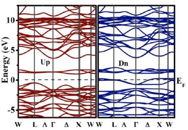 Band structure calculations along high symmetry directions of the first Brillouin zone for the Ba2CoMoO6 double perovskite are presented in figure 4 for the up and down spin configurations. In the picture, the energy of electrons as a function of wave vector k, along W-L- Λ-Γ-D-X-W directions is observed. From this figure, it is possible to infer that the Ba2CoMoO6 material evidences a conductive character for a spin channel and an insulating nature for the other spin orientation, with a strong contribution of the 3d orbital of the Co cations in the valence band close to the Fermi level.