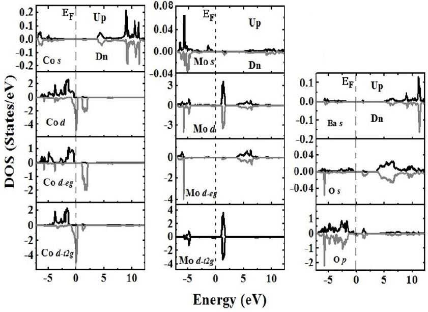 Partial DOS for Ba, Co, Mo and O atoms are presented in figure 5 for the up and down spin channels. It is observed in the pictures (figures 4 and 5) that the band structure is non-symmetrical around the Fermi level, which implies that there exists an effective magnetic moment. It was qualitatively determined orbitals Co.3d (t2g) are directly responsible for this response and the value of the effective magnetic moment was found to be 3.0 m.. The most relevant observation is relative to the exotic property of half-metallicity, which is characterized by the differentiated conducting response of the spin up and spin down orientations, and an integer value of the effective magnetic moment. The density of states as a function of energy clearly evidences that the majority spin component shows an energy gap at the Fermi level, as the insulating materials, and the other spin orientation is continuous at the Fermi level, due to the strong hybridization of Co.3d (t2g) and O-2p states. On the other hand, it is observed that the crystalline field evidences a splitting between t2g and eg levels of Co-3d.