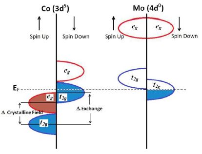 The left part of the figure describes the Co-3d states, where it is observed a strong exchange splitting between up and down spin configurations for both eg and t2gelectronic states. Meanwhile, the splitting of the crystalline field is not as strong as the exchange splitting. On the other hand, Mo-4d levels are described on the right side of this diagram. It is interesting to note that states eg show energy values that are higher than those observed for the states of the Co. In addition, in the case of Mo, the exchange splitting cannot be observed because of the superposition between its t2glevels for the spin down configuration, while the crystalline field is significantly large. A clear scheme related to the hopping interactions, which are considered responsible for the hybridization of the Co-3d and Mo- 4d states, can be consulted in C.M. Bonilla et al [28].