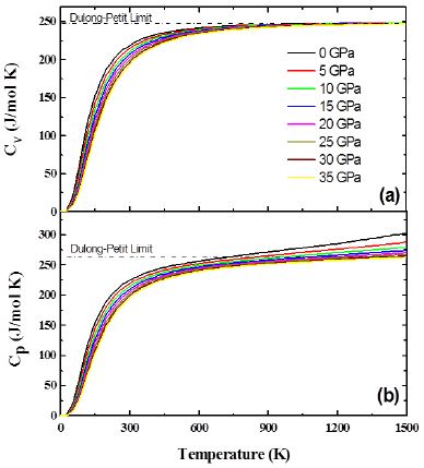 In order to study the thermophysical properties of Ba2CoMoO6, this was considered that variations in pressure modify the thermodynamic response of materials. For this purpose, these properties were calculated as a function of temperature, under the application of several pressure values up to 35 GPa, using as a starting point the state equation, and following the quasi-harmonic approximation of the Debye model. [29]. In figure 7, the results of the specific heat at constant volume (figure 7(a)) and at constant pressure (figure 7(b)) as a function of the temperature up to T=1500 K and under the application of pressures up to 35 GPa are exemplified. In these figures, it is possible to observe that the two curves show very similar behaviors in the low-temperature regime (up to 400 K) for all the applied pressure values. It is clear from figure 7(a) that the specific heat at constant volume tends strongly to adopt a value independent of temperature (for very high-temperature values), in the regime known as the Dulong-Petit limit. This characteristic is observed for all applied pressure (up to 35 GPa) with a value for the Dulong-Petit limit of 246.3 J/mol.K. On the other hand, figure 7(b) reveals that this tendency is not universal for the case of specific heat at constant pressure. This occurs because at high temperatures it is expected that the quasi- harmonic model of Debye will fail, so that the divergences presented in figure 7(b) would not essentially constitute a response of the material [10]. Meanwhile, under the application of relatively low pressures (less than 20 GPa) a certain tendency towards a Dulong-Petit limit between 263.1 J/mol.K and 274.4 J/mol.K can be established.
