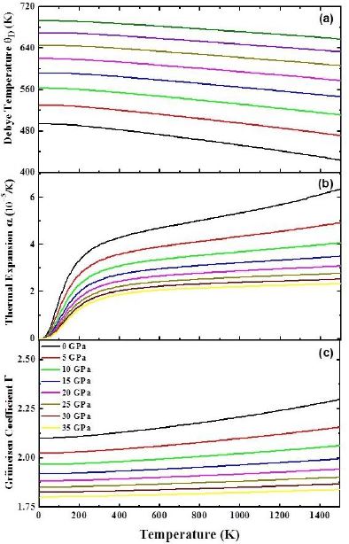 The calculations carried out have not considered that the increase in temperature can give rise to structural phase transitions and that these transitions modify the response of the thermophysical properties under study. In figure 8(c) the Grüneisen parameter decreases gradually with the increase in applied pressure (from 2.10 for P=0 GPa to 1.80 for P = 35 GPa, at T = 0 K). This behavior is observed for all temperatures that were considered in the calculations. In the meantime, it is also possible to see a continuous, smooth and non-linear growth of the Grüneisen parameter when the temperature is increased. At last, it can be stated that the behavior of the Grüneisen parameter as a function of temperature and pressure is a consequence of the variations produced in the vibration frequencies of the crystalline lattice, as previously discussed [34].
