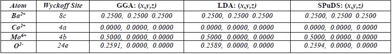 The muffin-tin radius of the elements was 2.4, 1.8, 1.8 and 1.8 (in au) Ba, Co, Mo and O respectfully, angular momentum up to l = 10 inside the muffin-tin sphere, a maximum vector in the reciprocal space of Gmáx =12.0, RMKAX=7, and a mesh of 1500 points in the first Brillouin zone (equivalent to a maximum of 56 k points in the irreducible Brillouin zone). Finally, the convergence criteria for the self-consistent calculation were 0.0001 Ry for the total energies, 0.0005 u.a in the charge and 1.0 mRy/u.a. in the internal forces. Spin polarization was included in the calculations. The quasi- harmonic Debye model is applied in order to calculate the thermophysical properties of the material as a function of temperature, such as the specific heat at constant volume and pressure, the thermal expansion of the crystal, the Debye temperature and the Grüneisen parameter [20].