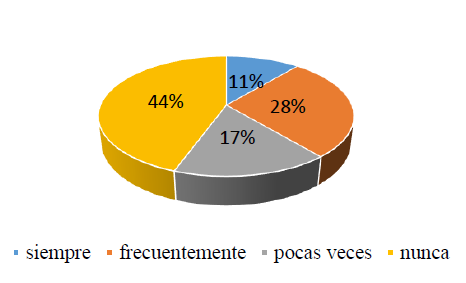 En cuanto al uso de herramientas tecnológicas que permitan reutlizar componentes, del total de los encuestados el 44% respondió nunca usan alguna herrmienta, mientras que el 17% pocas veces, el 28% frecuentemente y el 11% siempre. Se evidencia que la mayoría de estudiantes no hace uso de herramientas que faciliten la reutilización de código y que una minoría suele aplicar estas en sus procesos de desarrollo, esto puede deberse a una deficiencia en los procesos académicos relacionados a temas afines a la ingeniería del software basada en componentes o conceptos de reutilización de código.