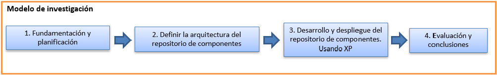 En la figura 1 se presenta el modelo de investigación llevado a cabo en este trabajo. Primero se realizó la fundamentación en el desarrollo de aplicaciones basadas en componentes, en las características de los repositorios y/o bibliotecas de componentes reutilizables para luego realizar la planificación de Colossal. Segundo se definió la arquitectura del repositorio, se basó en el modelo – vista – controlador y se definió el modelo de datos. Tercero, se realizó la codificiación y desplieuge del repositorio de componentes Colossal y por último se realizó una evaluación por parte de estudiantes y docentes del programa de Ingeniería de Sistemas de la Universidad Francisco de Paula Santander para verificar su funcionamiento y determinar su grado de aceptación.
