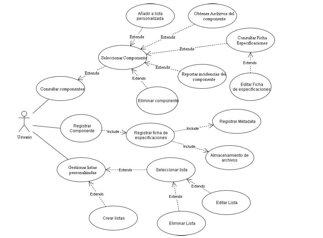 Cuando el usuario estándar selecciona un componente este puede acceder a revisar la ficha de especificaciones, así como descargar los archivos adjuntos y añadirlo a una lista personalizada. Si el usuario detecta fallos o alguna anomalía puede generar un reporte de incidencias para que un administrador lo revise. En caso de ser el autor, este podrá actualizar la información correspondiente a la ficha de especificaciones y en caso de desearlo eliminar el componente.