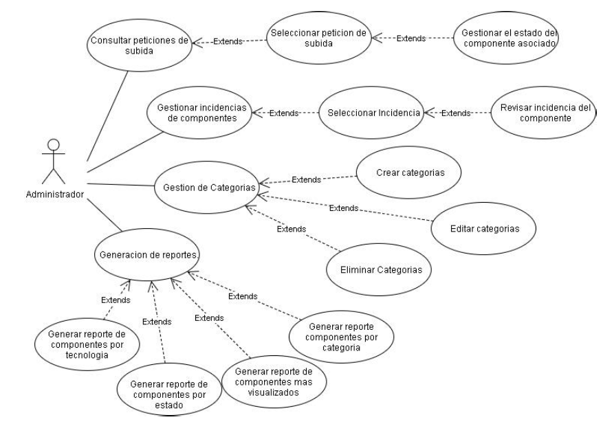 Gestión de peticiones de subida: el administrador consulta una serie de peticiones de subida que son generados por los usuarios cuando se registra un componente nuevo o se actualiza uno que ha sido rechazado, posteriormente estos determinan si el componente cumple con los criterios apropiados para ser aprobados y por ende desplegados dentro del repositorio, en caso contrario serán rechazados. también puede eliminar o recuperar componentes según sea necesario.