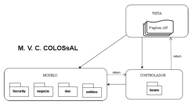 La relación entre las capas del modelo arquitectónico se realiza de la siguiente manera: En la vista, las paginas JSF referencian a las entidades obteniendo sus datos para ser mostrados en una tabla o caja de texto. También hace uso de los controladores que se encargan de cumplir distintas funciones y preparan los datos para ser procesados en el negocio mediante la clase Colossal.java, la cual se conecta con los DAO para realizar las distintas operaciones en la base de datos.