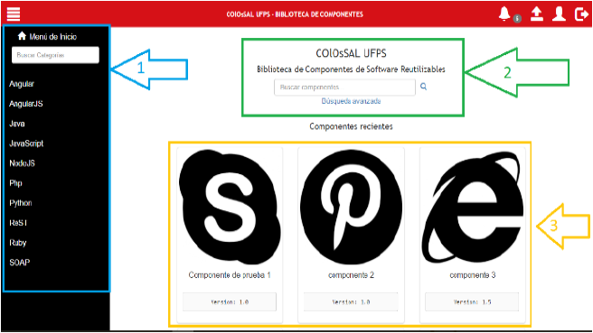 Luego de iniciar sesión se presenta la vista inicial del sistema donde se pueden encontrar los diferentes componentes software que han sido registrados y que pueden ser descargardos para ser utilizados en los proyectos de desarrollo.