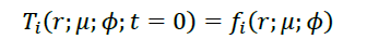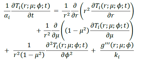 (10)En estas ecuaciones, 𝛼𝑖 es la difusividad térmica del material de la esfera 𝑖. Este parámetro se define como la relación entre la conductividad térmica (𝑘𝑖) y el producto de la densidad por el calor específico, (𝑘𝑖/𝜌𝑖𝑐𝑖). Sus unidades en el SI son m2s−1. 𝑇𝑖(𝑟;𝜇;𝜙;𝑡) es la temperatura de la esfera 𝑖 en K, y en función de la posición radial, del coseno del ángulo 𝜃 (azimutal, 𝜃=acos(𝜇)), del ángulo de elevación 𝜙 y del tiempo 𝑡. 𝜇=cos(𝜃), es un conveniente cambio de variable referenciado en la literatura. 𝑔′′′(𝑟;𝜇;𝜙) es la generación interna de energía (la generación volumétrica de calor), que para el presente trabajo solo existe para la esfera sólida interna (𝑖=1), y se considera constante en un primer caso y variable con la posición en la esfera (absorción preferente de la energía de las microondas dentro de la esfera) con el transcurrir del tiempo. Por simplicidad, ésta se simulará como un flujo de energía constante que transporta las ondas electromagnéticas. Sus unidades son Wm−3. 𝑘𝑖 es la conductividad térmica de la esfera 𝑖 con unidades Wm−1K−1. La energía irradiada por la resistencia eléctrica externa se incluye en el modelo matemático del proceso de calentamiento híbrido como una condición de frontera, con unidades Wm−2. Las ecuaciones diferenciales parciales se resolvieron utilizando el conocido método de elementos finitos, utilizando MATLAB para el enmallado y la solución numérica de las ecuaciones resultantes.