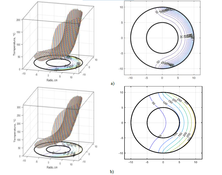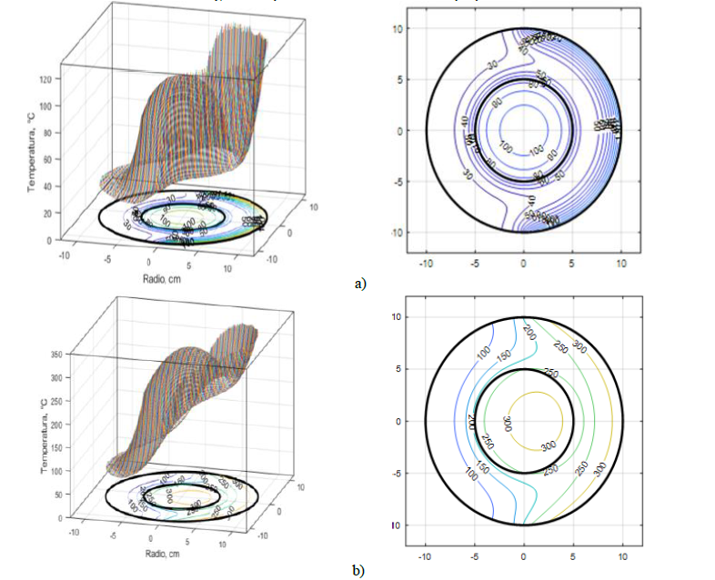 Seguidamente, en la figura 5(a,b) se encuentra el perfil de temperatura secuencial de las dos esferas. Ahora es la esfera interna la que alcanza perfiles de temperatura elevados en corto tiempo, y la externa permanece a temperaturas más bajas. Es evidente el cambio en la forma del perfil de temperatura del sistema.
