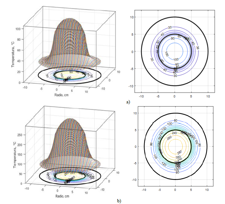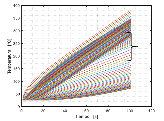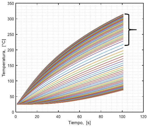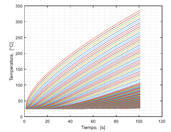 En la figura 6 se aprecia el gradiente de la temperatura en las esferas en función del tiempo, para los primeros 100 s de calentamiento simultáneo con la resistencia eléctrica y el magnetrón. Se resalta el radio de la esfera interna. Es claro el notable incremento de la temperatura superficial, así como la de la esfera interior, que alcanza valores aún más elevados.