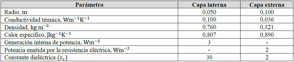 El modelo: el tratamiento térmico híbrido del sólido de dos capas se modela mediante el balance de energía (la ecuación de difusión de calor), alrededor del volumen de control definido por la esfera compuesta. El modelo expresado en coordenadas esféricas, aparece en la ecuación (1), y es válido para 𝑟=𝑟𝑖 en el rango 𝑖={1,2}. La solución analítica de esta ecuación se propuso recientemente en [16], pero ésta posee restricciones notables en el parámetro de generación volumétrica de calor dentro del sólido y las condiciones de frontera, ya que éstas solo pueden variar con la posición en el sólido, pero no con el tiempo. Igualmente, las propiedades termodinámicas como el calor específico, la densidad y la conductividad térmica, deben ser constantes con la temperatura y la posición, dentro de su misma fase. Si bien se comprobó que manteniendo estas restricciones tanto la solución numérica como la analítica concuerdan bastante bien, se decidió optar por resolver el problema mediante métodos numéricos, puesto que brindan una mayor libertad en los casos que se pueden simular.
