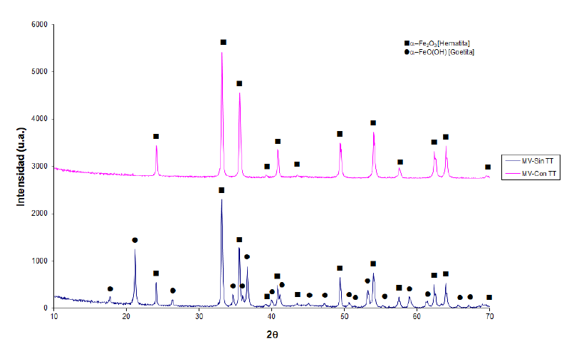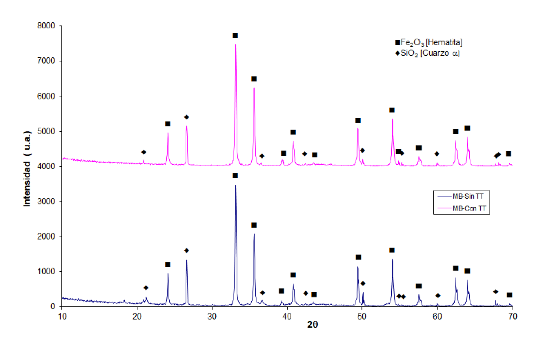 Aunque el difractograma del mineral brasileño, mostrado en la Figura 2, no muestra la presencia de fases hidroxiladas previo tratamiento térmico, sino sólo hematita y cuarzo α, la no identificación de tales fases pudo haber sido producto de las limitaciones naturales del método de análisis cuando se trata de fases presentes en porcentajes muy bajos; en el caso de la goetita, cuando se encuentra en una mezcla de compuestos con alto contenido de Fe el límite de detección es de 0,9% [20]. A diferencia de esto, en el difractograma del mineral venezolano previo tratamiento térmico, mostrado en la Figura 3, se identificó tanto la presencia de hematita como de goetita. Luego de realizar el tratamiento térmico, esta fase ya no es identificada, sólo la hematita, lo que confirma la pérdida de masa por deshidroxilación.