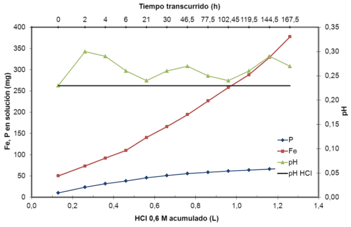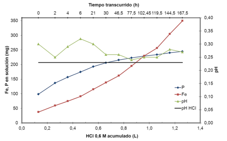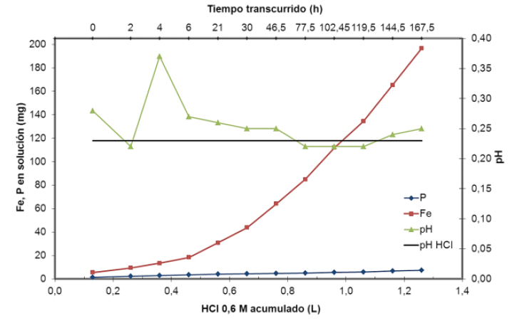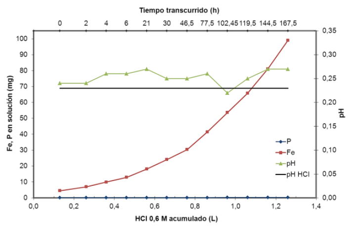 En la Figura 4, Figura 5, Figura 6 y Figura 7 se muestra la disolución de Fe y P, así como también el pH de la solución remanente en el proceso de lixiviación estática de cada tipo de mineral con respecto al volumen de HCl 0,6 M empleado. La disolución de Fe, aunque mucho mayor que el P en todos los casos, es despreciable con respecto a la cantidad de hierro que contienen los minerales originalmente; apenas se disolvió el 0,12% de Fe de los minerales sin tratamiento térmico y el 0,27% de los mismos sometidos a tratamiento térmico valores similares a los reportados en estudios realizados anteriormente [8].