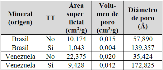 (3)Tanto la transformación descrita anteriormente como la pérdida de agua retenida por capilaridad en los poros del mineral generan un incremento del diámetro de poro del mineral [14, 24, 25], lo que se muestra en la Tabla 2.
