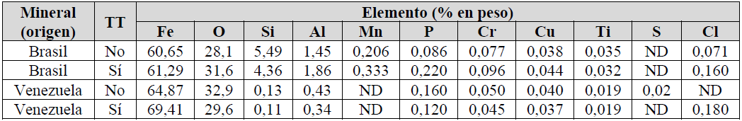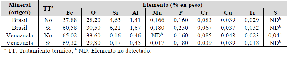 El mineral venezolano está constituido por una mayor fracción de Fe pero, en general, el porcentaje de fósforo es similar para ambos tipos de minerales. Además de los elementos mayoritarios asociados a óxidos de hierro, el mineral brasileño también posee un porcentaje considerable de Si. En los minerales sometidos a tratamiento térmico se produjo una redistribución porcentual de los elementos químicos constituyentes, posiblemente debido a la pérdida de masa asociada a la deshidroxilación de los óxidos metálicos y silicatos [19].