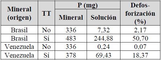 Se evidencia que un tratamiento térmico previo favorece la extracción de P tanto en el mineral brasileño como en el venezolano, lográndose alcanzar valores de defosforización considerablemente elevados con respecto a aquellos obtenidos en los minerales sin tratamiento térmico; el porcentaje de defosforización es 23 veces mayor en el mineral brasileño y 262 veces en el mineral venezolano, según se puede extraer de los resultados mostrados en la Tabla 3.