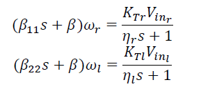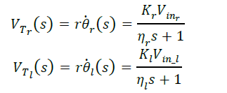 (6)Se tiene: 𝐾𝑖 ganancia del sistema, 𝑉𝑖𝑛_𝑖 voltaje de entrada al conjunto manejador de potencia - motor, 𝜂𝑖 constante de tiempo del sistema y el subíndice 𝑖 hace referencia a motor derecho (𝑟) y motor izquierdo (𝑙).