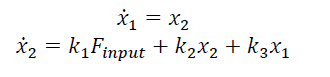 (8)siendo 𝐹𝑖𝑛𝑝𝑢𝑡 la señal de entrada al sistema (para el caso 𝑉𝑖𝑛), 𝑥1 y 𝑥2 las variables de estado del sistema (para el caso es 𝑢 o 𝜓) y, 𝑘1, 𝑘2, y 𝑘3 constantes que se definen de los diferentes coeficietnes del modelo (para el caso (𝛽11, 𝛽, 𝐾𝑇𝑖,𝜂𝑖).