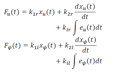 (9)donde 𝑒𝑢(𝑡)=𝑢𝑑(𝑡)−𝑢(𝑡) y 𝑒𝜓(𝑡)=𝜓𝑑(𝑡)−𝜓(𝑡), siendo 𝑢𝑑 y 𝜓𝑑 las referencias deseadas para la velocidad traslacional y la orientación del robot, respectivamente. Las mediciones entregadas por la central inercial embarcada - Spatial del fabricante Advanced Navigation, permiten tener disponibles sobre la base de un filtro de Kalman los estados de: velocidad traslacional (𝑥𝑢) y su derivada (𝑥𝑢̇), así como la orientación (𝑥𝜓) y su velocidad (𝑥𝜓̇). Recuerdese que la velocidad traslacional (𝑢) medida es con respecto al centro de gravedad del robot, la orientación 𝜓 y la velocidad rotacional medida es 𝜔=𝜓̇.