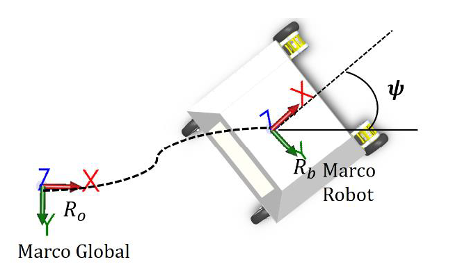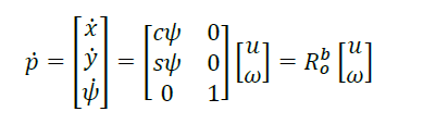 Si el robot se desplaza a una velocidad traslacional 𝑢, con una velocidad rotacional 𝜔, medidas en el marco local 𝑅𝑏, estas pueden ser llevadas al sistema coordenado global 𝑅𝑜 mediante una matriz de transformación. Denotando 𝑃 como la posición (𝑥, 𝑦), y la orientación (𝜓) del robot en el marco referencial 𝑅𝑜, la relación que vincula las velocidades descritas en 𝑅𝑏 (𝑢, 𝜔), es presentada por la Ecuación 1.