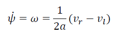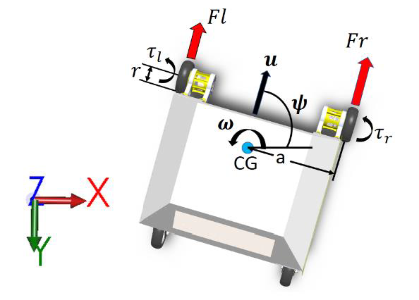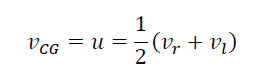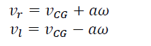 De las expresiones anteriores, se tiene que la velocidad tangencial de la llanta derecha e izquierda son 𝑣𝑟=𝑟𝜃𝑟 y 𝑣𝑙=𝑟𝜃𝑙 , respectivamente. El coeficiente 𝑎 relaciona la distancia medida desde la llanta al centro de gravedad - CG.