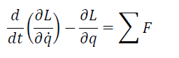 El modelado por Euler-Lagrange se fundamenta en la energía cinética (𝐾) y la energía potencial (𝑃). Con estas energias se construye el Lagrangiano ((𝐿=𝐾−𝑃)), al cual se le aplica la ecuación dinámica por Lagrange, que es presentada por la Ecuación 4. Este enfoque permite, en muchos casos complementar el modelado por Newton-Euler. Para el presente caso, permitió completar dinámicas asociadas a la geometría de la estructura y sus dimensiones (datos que se determinan desde el CAD del sistema y corroborados desde el sistema físico).