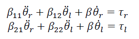 Para plantear un modelo para el diseño del control, se parte de la Ecuación 6 y la Ecuación 5, donde las dinámicas de mayor relevancia para el sistema se conservan, que para el actual caso son los términos 𝛽11 y 𝛽22. Los términos 𝛽12 y 𝛽21 están sobre 13% del valor de los parámetros de mayor relevancia, considerándose estos despreciables (en la literatura de control se pueden ver como parámetros que aportan polos no dominantes). Lo anterior, permite plantear un modelo afín, donde las velocidades reflejadas por las llantas son consideradas desacopladas, todo en el marco de contemplar velocidades de desplazamiento de la estructura entre 0.4 m/s y 1 m/s en su desplazamiento traslacional. Con esto, la Ecuación 6 y la Ecuación 5 se pueden unir y reescribir como se muestra en la Ecuación 7.