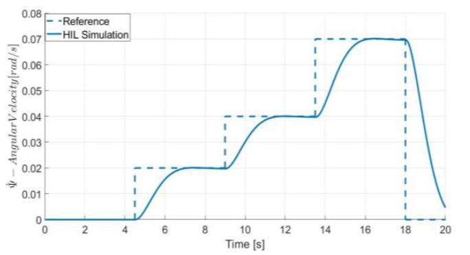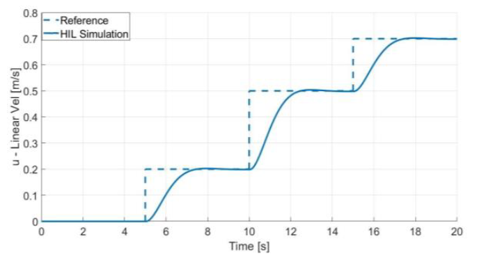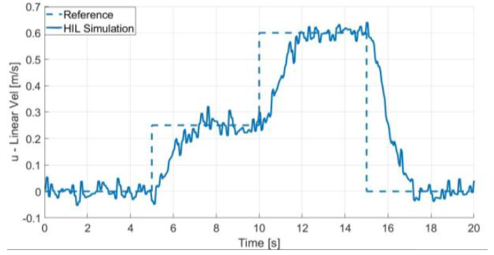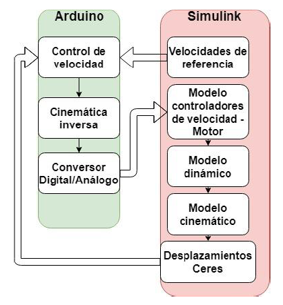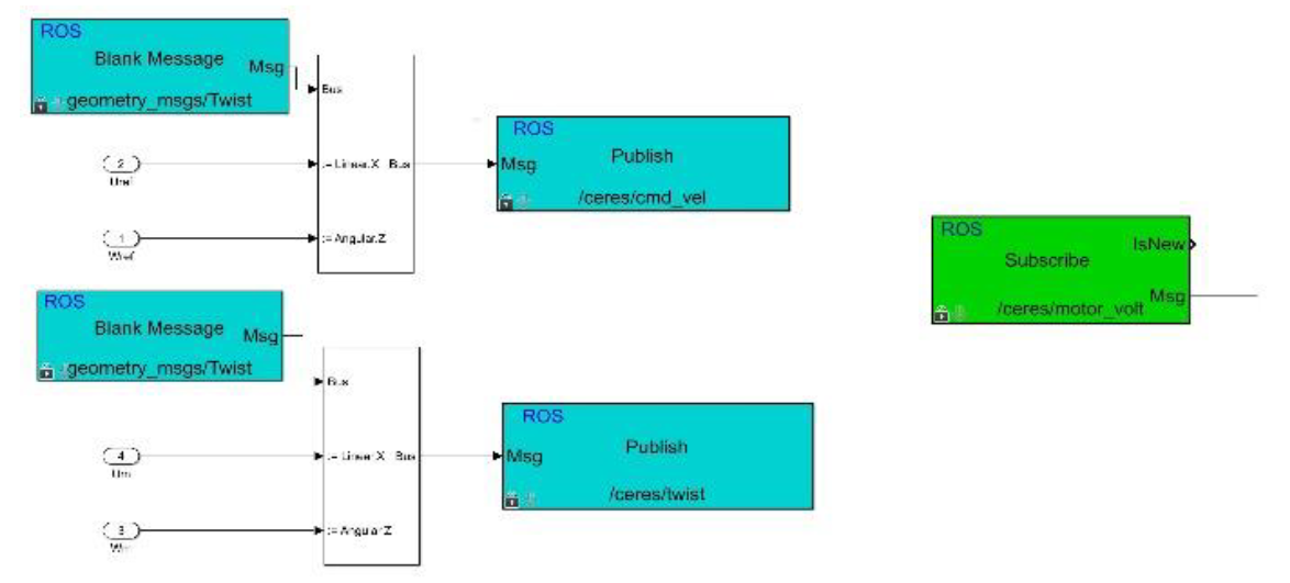 En la búsqueda de implementar los reguladores sobre el sistema embarcado del robot, se realizaron pruebas en simulación, que se convirtieron en el punto de partida para las ecuaciones que se codificaron en el hardware final sobre ROS [9], permitiendo la posterior realización de simulaciones HIL, que den una mayor certeza del funcionamiento de la plataforma durante las pruebas reales. Este software brindo modularidad en los procesos como lectura de sensores, control de actuadores y cálculo de leyes de control, lo cual permitió la integración del modelo desarrollado como un nodo de la red funcionando en el entorno Simulink, mostrando la funcionalidad del esquema planteado para las pruebas previas de la plataforma CERES.