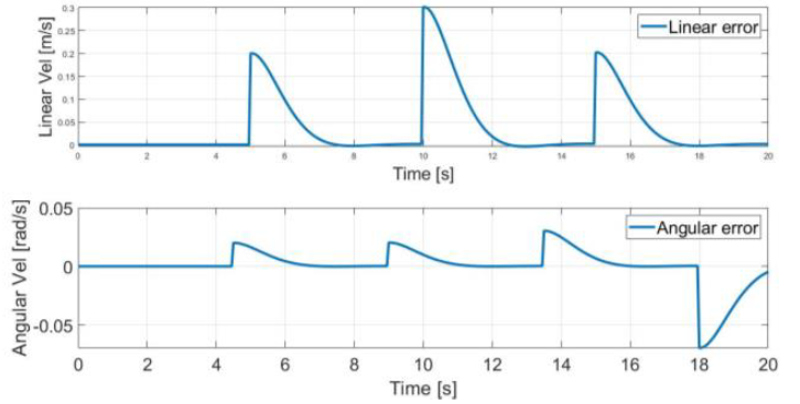Las simulaciones de validación se realizaron probando el seguimiento a referencias tipo multi escalón con una velocidad traslacional de 𝑢𝑑1=0.2m/s, 𝑢𝑑2=0.5m/s y 𝑢𝑑3=0.7m/s y una velocidad angular de 𝜓̇𝑑1= 0.2 rad/s, 𝜓̇𝑑2=0.4 rad/s y 𝜓̇𝑑3=0.7 rad/s, los resultados son presentados en la El comportamiento del error en las pruebas con ruido añadido se aproxima a cero, manteniendo los tiempos de establecimiento de 1 segundo en las validaciones iniciales, el cual se muestra en la Figura 13. Figura 8 y Figura 9.
