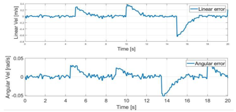 En la Figura 11 y Figura 12 se muestra las respuestas en velocidad angular y lineal obtenidas cuando se tiene ruido añadido, mostrando estabilidad y seguimiento de la señal de referencia.